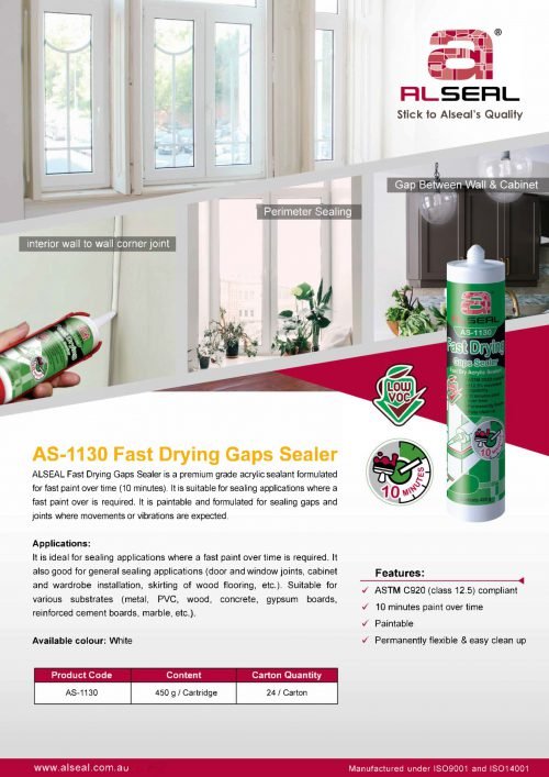 AS-1130 sealer is ideal for sealing applications where fast paint overtime is required. It is also good for general sealing applications (door and window joints, cabinet and wardrobe installation, skirting of wood flooring, etc.).