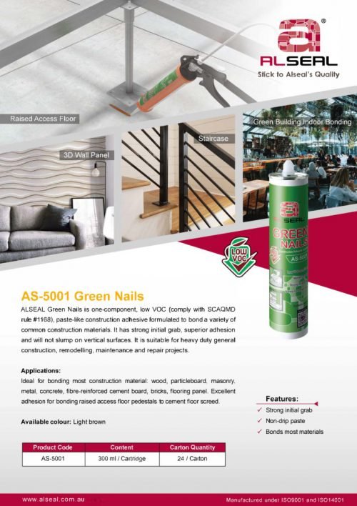 Green Nails AS-5001 is a one-component, low VOC (compliant with SCAQMD Regulation No. 1168), a paste-like construction adhesive designed to bond a variety of common building materials. It has a strong initial gripper, superior adhesion, and will not slump on vertical surfaces. It is suitable for heavy general construction, conversion, maintenance, and repair projects.